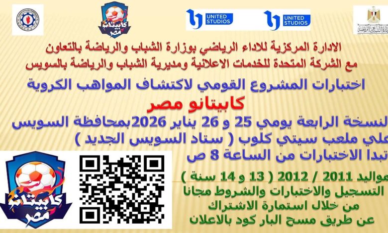 أعلنت مديرية الشباب والرياضة بمحافظة السويس ، برئاسة الاستاذه سماح مهدي، عن انطلاق فعاليات الموسم الرابع من مشروع «كابيتانو مصر 2026»، أكبر منظومة متكاملة لاكتشاف وصقل ورعاية المواهب الكروية، وذلك يومي 25 و26 يناير 2026، على ستاد السويس الجديد مفخره الشرق الأوسط في استضافة جديدة تعكس مكانة و دعم الحركة الرياضية بالمحافظة الباسله السويس