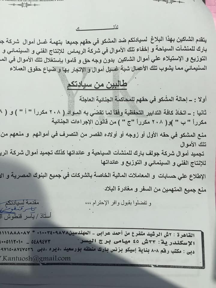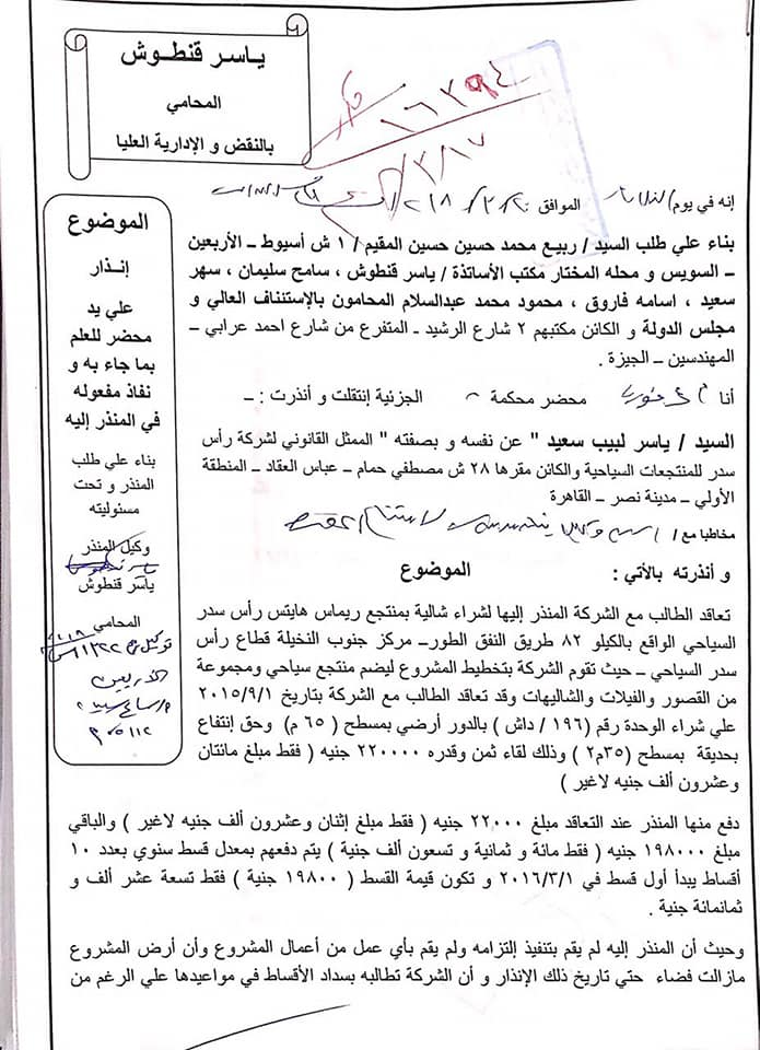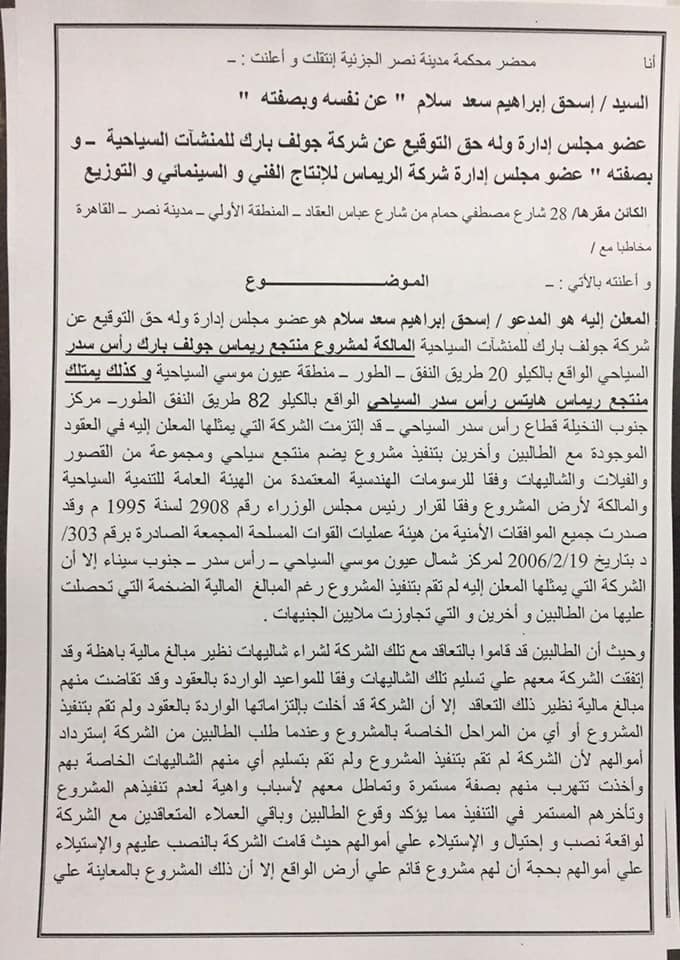 مستندات..خمسة آلاف سويسي يرفعون على مالك احد القرى السياحية بعيون موسى …نصب علينا وأنتج افلام بأموالنا ولم يسلمنا الوحدات !!