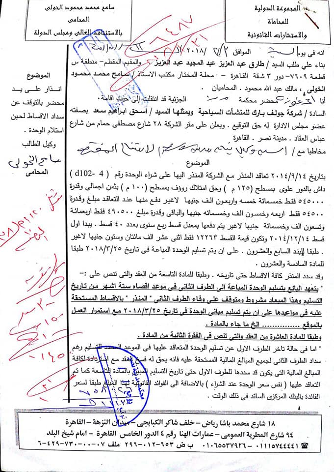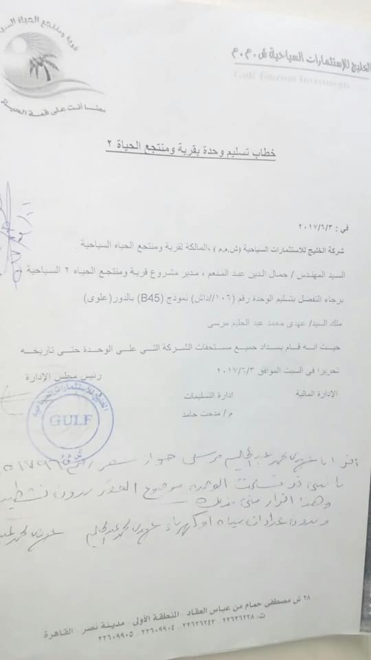 وقدم المواطنون مستندات التعاقد بينهم وبين صاحب القرية السياحية والتي تنص على تسليمهم الوحدات السكنية خلال مدة معينة تجاوزتها بعدة اعوام ولم يتسلمو وحداتهم ولم يقم المالك ببناء المراحل التالية للمتعاقدين .