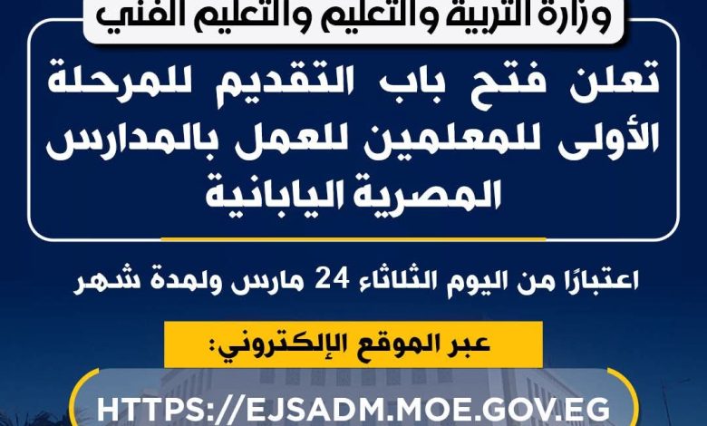 وزارة التربية والتعليم تعلن فتح باب التقديم للمرحلة الأولى للمعلمين للعمل بالمدارس المصرية اليابانية