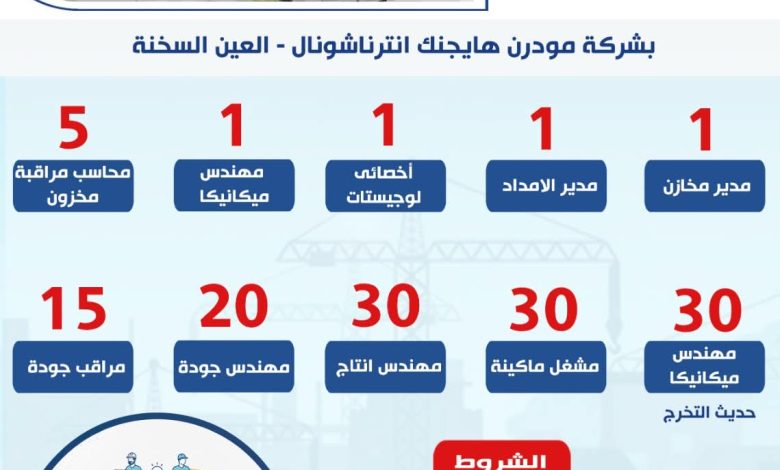 وزارة العمل: 134 فرصة عمل جديدة بشركة مودرن هايچنك إنترناشونال بالعين السخنة