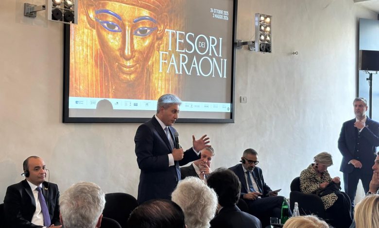 عقد السيد شريف فتحي وزير السياحة والآثار والسيد أليساندرو جولي وزير الثقافة الإيطالي مؤتمراً صحفياً عالمياً بقاعة Scuderie del Quirinale، بحضور اكثر من 100 قناة وإذاعة وصحيفة ووكالة أنباء دولية وإيطالية والذين قاموا بجولة داخل المعرض وتصويره. حضر المؤتمر السفير بسام راضي سفير مصر في إيطاليا والدكتور محمد إسماعيل خالد الأمين العام للمجلس الأعلى للآثار والدكتور طارق العوضي المشرف على المعرض والدكتور محمد شعبان معاون الوزير للتحول الرقمي ولفيف من مديري المتاحف في إيطاليا.واستهل السيد شريف فتحي كلمته بتوجيه الشكر لفخامة رئيس الجمهورية الإيطالي سيرجيو ماتاريلا على اهتمامه ورعايته وافتتاحه للمعرض، مشيراً إلى الرمزية الخاصة لاستضافة المعرض في قاعة Scuderie del Quirinale المجاورة لقصر كويرينالي، المقر الرسمي لرئيس الجمهورية الإيطالية يجسد المكانة المتميزة التي تحظى بها الحضارة المصرية في الوجدان الإيطالي. كما أعرب السيد الوزير عن إعجابه بالمعرض وأسلوب عرض الكنوز المصرية التي تبرز جمالها وعراقتها ومهارة الفنان المصري القديم، مقدماً الشكر لفريق العمل من الجانب المصري والإيطالي لإخراج هذا المعرض الرائع الذي يروي عراقة وتاريخ الحضارة المصرية.وأشار إلى أن هذا المعرض سيعمل على مزيد من الترويج السياحي للمقصد المصري الذي يجذب عدد كبير من السائحين الإيطاليين الوافدين إليه والذين من المتوقع أن يصل عددهم إلى مليون سائح هذا العام.كما تحدث عن المتحف المصري الكبير والاستعدادات الجارية للافتتاح الوشيك يوم ١ نوفمبر القادم والذي سيحظي بحضور رفيع المستوى.وأضاف السيد الوزير أن مصر تولي أهمية كبيرة لتعزيز أواصر التعاون والشراكة مع إيطاليا في مختلف المجالات، ولا سيما في قطاعي السياحة والآثار، لما لهما من دور محوري في تعميق التفاهم المتبادل وتعزيز التواصل بين الشعوب وبناء جسور للحوار بين الحضارات.وأكد السيد الوزير على أن معرض “كنوز الفراعنة” ليس مجرد عرض للآثار المصرية، بل هو احتفاء بالصداقة والدبلوماسية الثقافية، ورسالة محبة وتقدير موجهة إلى الشعب الإيطالي لاكتشاف التراث الأثري الغني لمصر.وفي ختام كلمته، أشار السيد الوزير إلى أنه على الرغم من مرور عشرين عاماً على آخر معرض للآثار المصرية أُقيم في إيطاليا، فإن تنظيم معرض “كنوز الفراعنة” الأن يمثل انطلاقة جديدة لسلسلة من الفعاليات الثقافية المصرية في روما موضحاً أنه من المقرر تنظيم معرض آخر مخصص لبورتريهات الفيوم بعد فترة وجيزة من اختتام هذا المعرض.ومن جانبه، أعرب وزير الثقافة الإيطالي في كلمته عن سعادته بافتتاح معرض “كنوز الفراعنة”، الذي يتزامن مع احتفالات إيطاليا باليوبيل الثقافي، مشيراً إلى عمق العلاقات التاريخية التي تجمع بين مصر وإيطاليا والتي تمتد عبر قرون، باعتبارهما من أقدم حضارات دول البحر المتوسط.وأشار إلى أن العلاقات بين البلدين تتجاوز الأطر التقليدية للتعاون الثنائي، مؤكداً أنه لا يوجد وسيلة أعمق ولا أنبل من الثقافة لتعزيز جسور التواصل والتفاهم بين الشعوب.وفي كلمته وصف الأمين العام للمجلس الأعلى للآثار فكرة إقامة هذا المعرض في روما في قاعة Scuderie del Quirinale، بالرائعة الأمر الذي سيعمل على جذب آلاف الزائرين إليه ليس من إيطاليا بل من جميع دول أوروبا.وأشار أن افتتاح المعرض اليوم لم يكن بالأمر اليسير. ولكنه ثمرة عمل ومجهود لشهور طويلة لاختيار القطع الأثرية وترميمها وتجهيزها ونقلها وعرضها بروما.وأعلن الأمين العام للمجلس الأعلى للآثار، عن مشروع تعاون جديد مع الجانب الإيطالي وهو إحياءً نظام التهوية الأصلي للمتحف المصري بالتحرير والذي نفذته شركة إيطالية بالمتحف عام 1902 عند افتتاحه.من جانبه، أشار الدكتور طارق العوضي، المشرف على المعرض، إلى أن اختيار القطع الأثرية المعروضة جاء مستلهماً من الصورة التي رسمتها الكتابات الرومانية القديمة لمصر، والتي وصفتها بأنها أرض السحر والأسرار والعجائب والعظمة. وأوضح أنه تم الحرص 