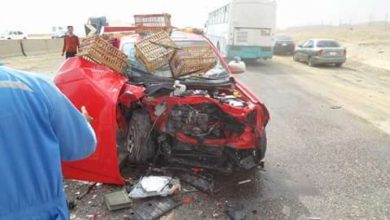 بالصور : مصرع شخص واصابة 2 اخرين في حادث تصادم امام المجزر الالي بطريق السويس – السخنة