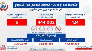 الصحة: متوسط الإصابات اليومي بلغ 124 إصابة إيجابية بفيروس كورونا .. و 6 حالات وفاة و عدد المتعافين اليومي بلغ 260