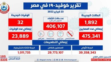 الصحة: تسجيل 1892 حالة إيجابية جديدة بفيروس كورونا .. و 32 حالة وفاة