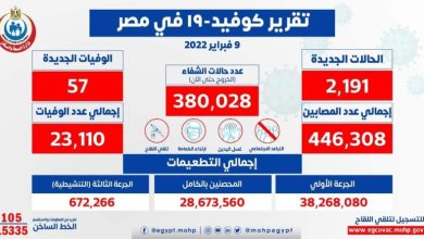 الصحة: تسجيل 2191 حالة إيجابية جديدة بفيروس كورونا .. و 57 حالة وفاة