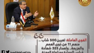 أعلن وزير القوى العاملة محمد سعفان، قيام مديرية القوي العاملة بمحافظة أسيوط بتعيين 500 شاب من حملة المؤهلات العليا والمتوسطة…