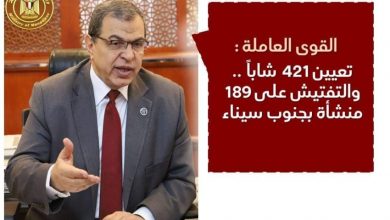 أعلن وزير القوى العاملة محمد سعفان، قيام مديرية القوى العاملة بجنوب سيناء بتعيين 421 شاباً ، من حملة المؤهلات…