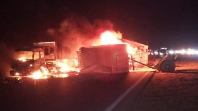 مصرع شخص واصابه اخر في حادث تصادم و أشتعال سيارتين تقل بطريق جنيفة بالسويس