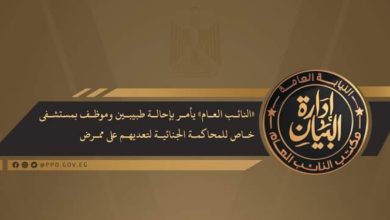 أمر «السيد المستشار النائب العام» اليوم الثلاثاء الموافق الرابع عشر من شهر سبتمبر الجاري بإحالة ثلاثة متهمين محبوسين؛ طبيبين وموظف…