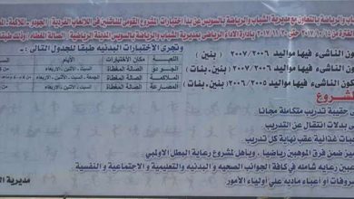 تعلن وزارة الشباب والرياضة بالتعاون مع مديرية الشباب والرياضة بالسويس عن بدأ أختبارات المشروع القومى للناشئين فى…