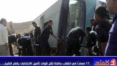 أصيب 11 من قوات تأمين الانتخابات بكفر الشيخ في انقلاب حافلة كانت تقلهم، اليوم الاثنين، على طريق “فوه – رشيد”،…