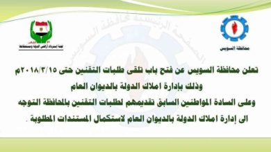 فتح باب التقدم لتلقي طلبات التقنين بمحافظة السويس حتي 15 مارس 2018