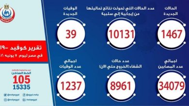 الصحة: تسجيل 1467 حالة إيجابية لفيروس كورونا باجمالي٣٤٠٧٩ و 39 حالة وفاة باجمالي ١٢٣٧ وشفاء ٨٩٦١