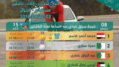 مصر تواصل هيمنتها على ذهبيات اليوم الرابع من البطولة العريية بالجزائرفي سباق فردي ضد الساعه للناشئين