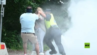 امرأة تهاجم موميكا بمطفأة حريق لردعه عن إحراق نسخة من القرآن الكريم في ستوكهولم
