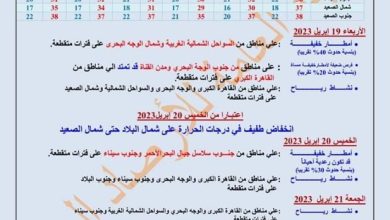 أعلنت الهيئة العامة للأرصاد الجوية تفاصيل حالة الطقس المتوقعة خلال الفترة من الاثنين 17 أبريل 2023 إلى السبت 22 أبريل…